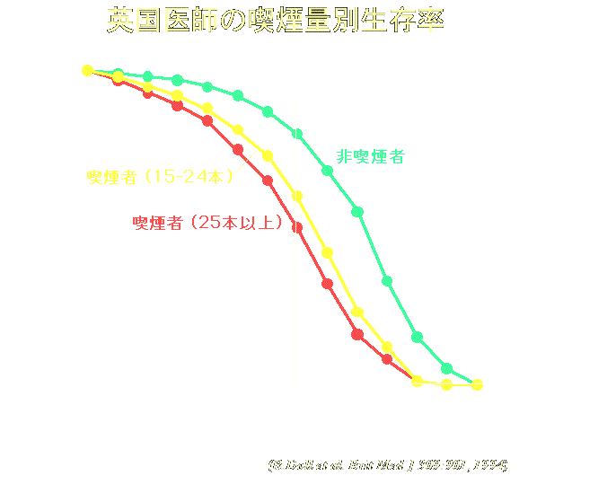 で、1日25本以上の喫煙者は70歳での生存率が50%です(非喫煙者は80%)。