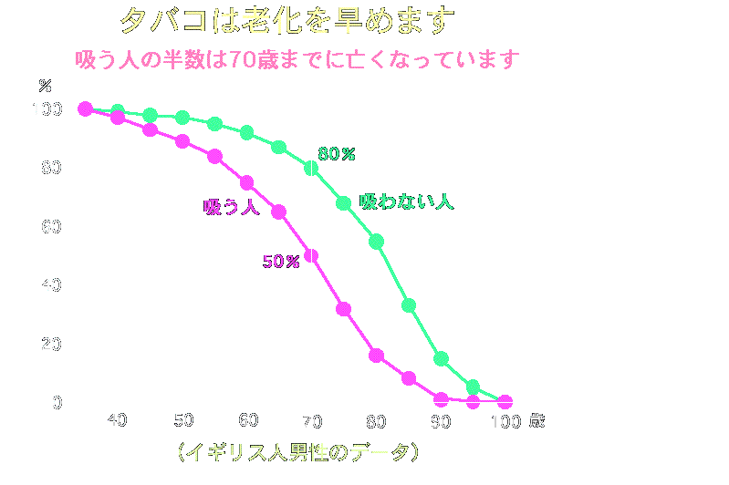 英国の男性医師のデータですので、日本人には完全には当てはまらないかも知れませんが、喫煙者と非喫煙者の差という面からはほとんど違わないと思います。ちなみに英国の平均寿命は、男性75歳、女性80歳で(1998年)、日本より2〜3年短いようです。